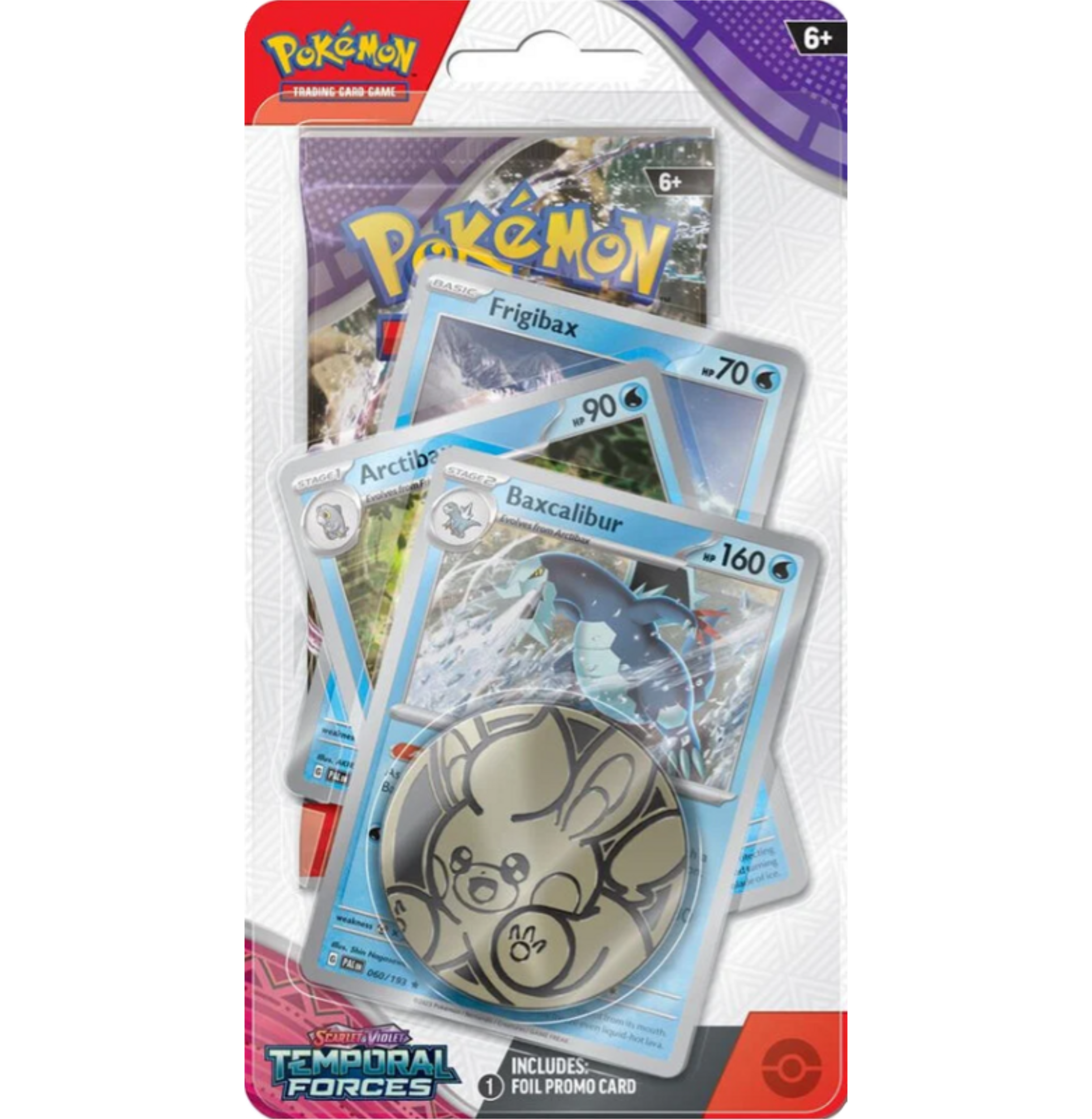 SV Temporal Forces Premium Checklane Blister, comes with 1x SV Temporal Forces Booster pack, a special flip coin, and the Baxcalibur Evolution line.
